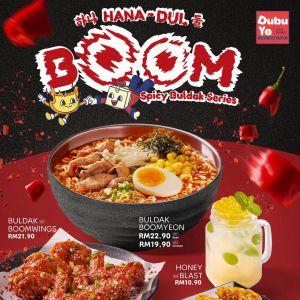 DubuYo's new Hana-Dul-BOOM has landed! Dare to slurp Korea's hottest bowl with the extra spicy Buldak Series: Buldak Boomyeon (Ramyeon), Buldak Boomwings & Honey Blast.
